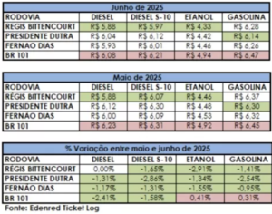 Na BR-101, o diesel comum foi comercializado, em média, por R$ 6,08, registrando queda de 2,41% em relação a maio, enquanto o diesel S-10 teve média de R$ 6,21, recuando 1,58% no mesmo período. Por outro lado, a gasolina e o etanol tiveram alta na rodovia. O litro da gasolina foi vendido a R$ 6,47 (alta de 0,31%), e o etanol atingiu R$ 4,94 (aumento de 0,41%).