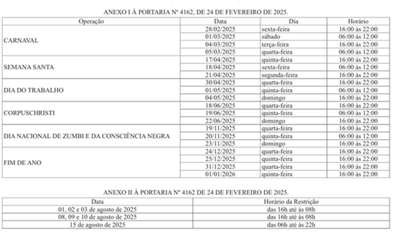 Art . 1º – Fica proibido, nas datas e horários indicados nos Anexos I e II desta Portaria, o trânsito de Veículos ou Combinações de Veículos, passíveis ou não de Autorização Especial de Trânsito (AET) ou Autorização Específica (AE), cujo peso ou dimensão exceda qualquer um dos seguintes limites regulamentares: