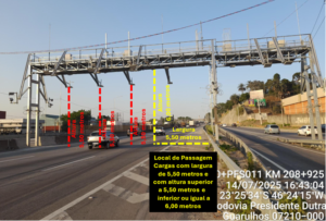 Ocorre que, para facilitar a transposição das cargas especiais que saem da Hitachi em Guarulhos sentido Rio de Janeiro, com altura superior a 5,50 metros, a Concessionária realizou adequação no pórtico Free Flow instalado no Km 208+900, sentido Rio de Janeiro (Pista Expressa Norte), a fim de que estas realizem a passagem pelo pórtico utilizando a metade da 3ª faixa de rolamento da via e acostamento (lado direito da pista), evitando assim a necessidade de programação especial para remoção das antenas do pórtico.