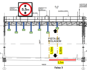 A sinalização de limitação de altura do pórtico disposto no Km 208+900 na pista expressa no sentido Norte, permanecerá com a informação de altura limitada em 5,50 metros, em função das demais faixas presentes na via, sendo certo que, pela metade da 3ª faixa, se a largura não for superior a 5,50 metros será permitida a passagem de veículos com altura de até 6,00 metros sem necessidade da remoção das antenas dos pórticos.