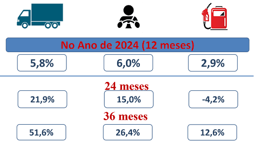 Essa defasagem entre o frete recebido e os custos apurados pela NTC&LOGÍSTICA demonstra bem como é difícil recompor tudo que foi perdido ao longo do tempo. Por exemplo, o combustível, antes do recente anúncio de aumento pela Petrobras, em 31 de janeiro de 2025, estava praticamente estável nos 18 meses anteriores, sendo que, considerando os últimos 3 anos, já acumula uma alta de 12,6%. O preço do caminhão é outro exemplo: variou 5,8% no último ano, porém, em 36 meses, o acumulado atingiu 51,6%.