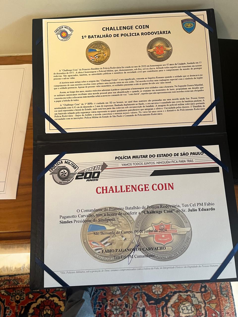 Ontem à noite, 6 de junho, em cerimônia ocorrida na sede do 1º Batalhão de Polícia Rodoviária do Estado, o Sr. Júlio Eduardo Simões, presidente do SINDIPESA, recebeu a Challenge Coin de Honra ao Mérito.
