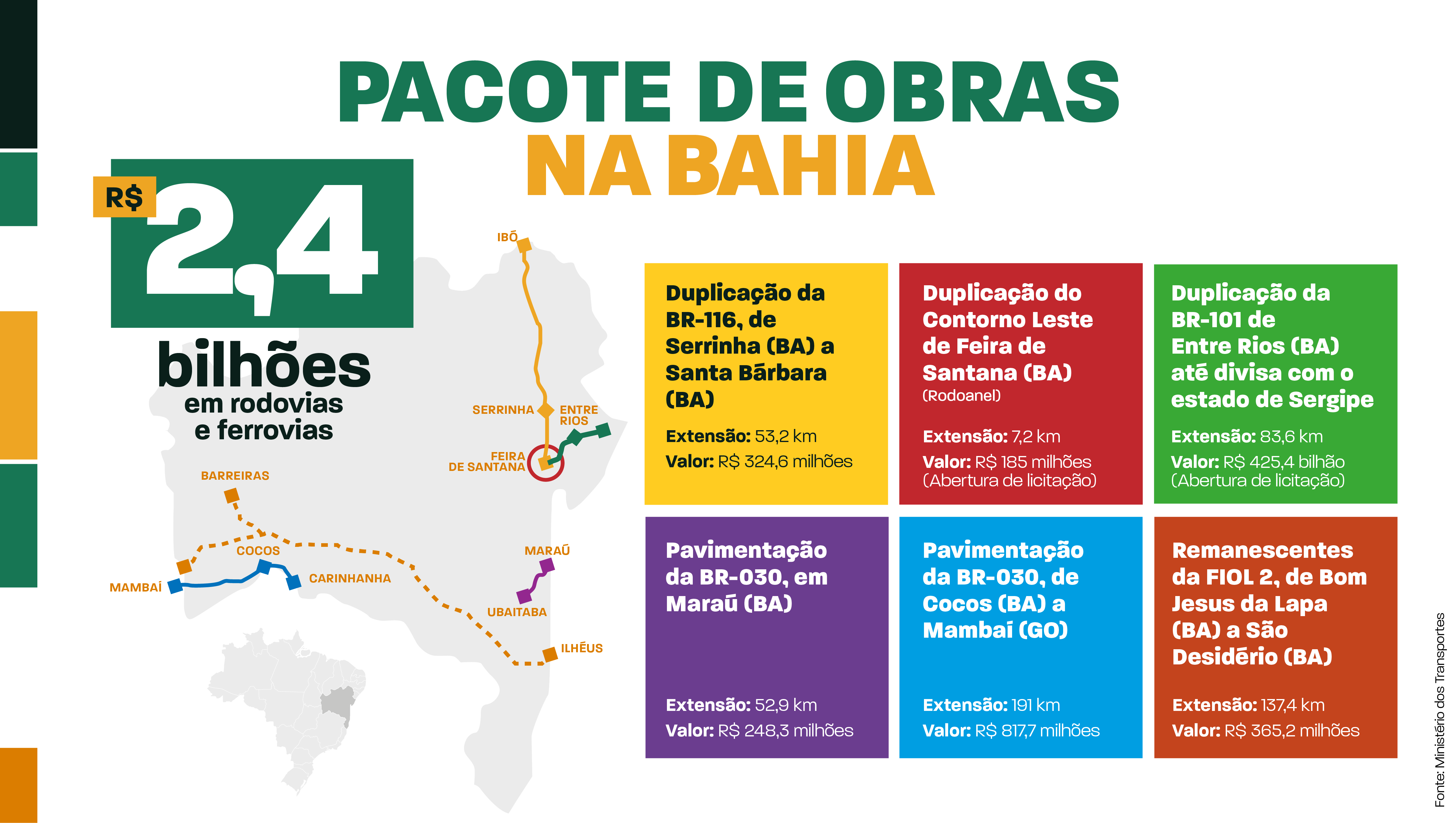 Durante a entrega da duplicação da rodovia federal, o presidente e o ministro anunciaram uma nova leva de obras rodoviárias e ferroviárias para a Bahia. Veja abaixo onde serão distribuídos os investimentos: