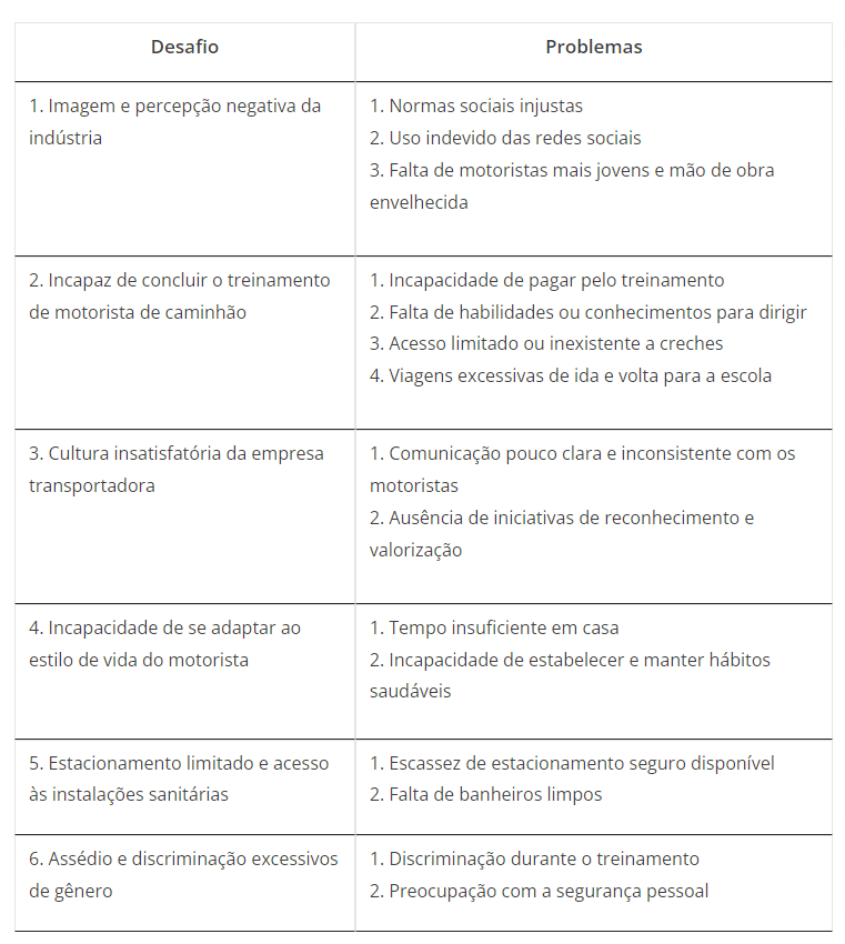De acordo com o estudo, existem seis desafios principais para as mulheres no setor de transportes, que podem ser vistas no quadro abaixo: