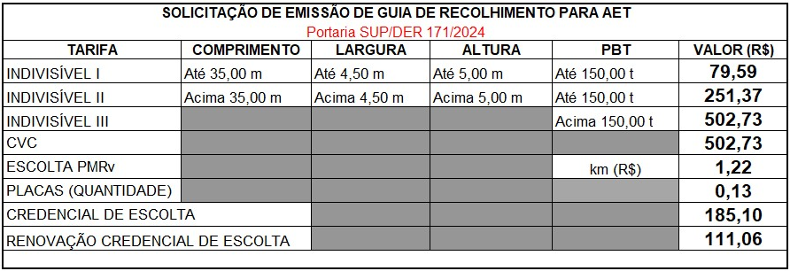 Foi publicado, no Diário Oficial, em 20 de dezembro de 2024, a Portaria SUP/DER 171/2024, que estabelece os novos valores para a expedição da Autorização Especial de Trânsito (AET) para o ano de 2025.