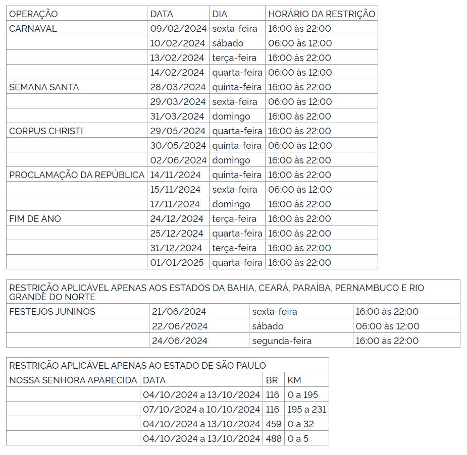 Além das restrições já existentes, destacadas no quadro abaixo, houve a inclusão do feriado de Nossa Senhora Aparecida. As rodovias e os trechos em que as restrições vão ocorrer estão no final do texto.