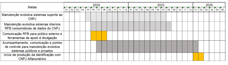 O cronograma estabelecido pela Receita Federal prevê que o novo CNPJ alfanumérico estará completamente implementado a partir de janeiro de 2026, conforme mostra a tabela abaixo: