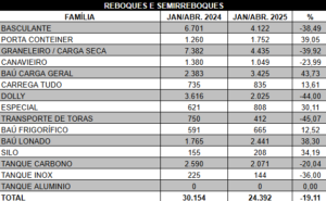 O mercado de implementos rodoviários registrou um recuo de 3,72% nas vendas entre janeiro e abril de 2025, com 48.005 unidades emplacadas, ante 49.862 no mesmo período de 2024. Os dados foram divulgados pela Associação Nacional dos Fabricantes de Implementos Rodoviários (ANFIR), que aponta os juros elevados como um dos principais fatores para a retração.