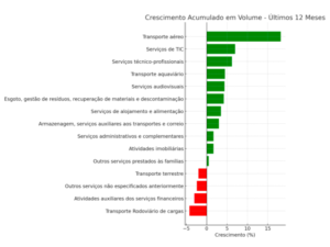 A atividade com maior crescimento no período foi o transporte aéreo, com alta de 18,2%, seguida pelos serviços de tecnologia da informação, com 11,4%.