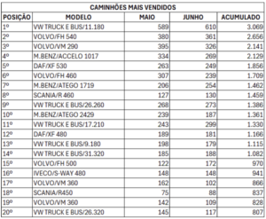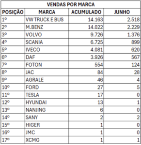 Entre as montadoras, o destaque segue com a Volkswagen, que já registra 14.163 emplacamentos, ficando 141 unidades à frente da Mercedes-Benz, segunda colocada, que vendeu 14.022 caminhões nesse ano.
